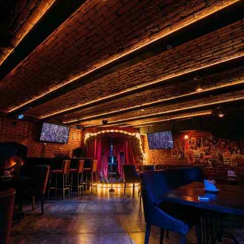 Одной из особенностей гастробара является караоке-рум, расположенный в нижнем зале. Пространство оформлено в уютном стиле с приглушенным светом, деревянными элементами декора и сценой с бархатными кулисами. Современное звуковое оборудование, микрофоны и профессиональная акустика дают возможность гостям почувствовать себя артистами. Караоке-зал рассчитан на 30-35 человек, что делает его удобным вариантом для небольших компаний.